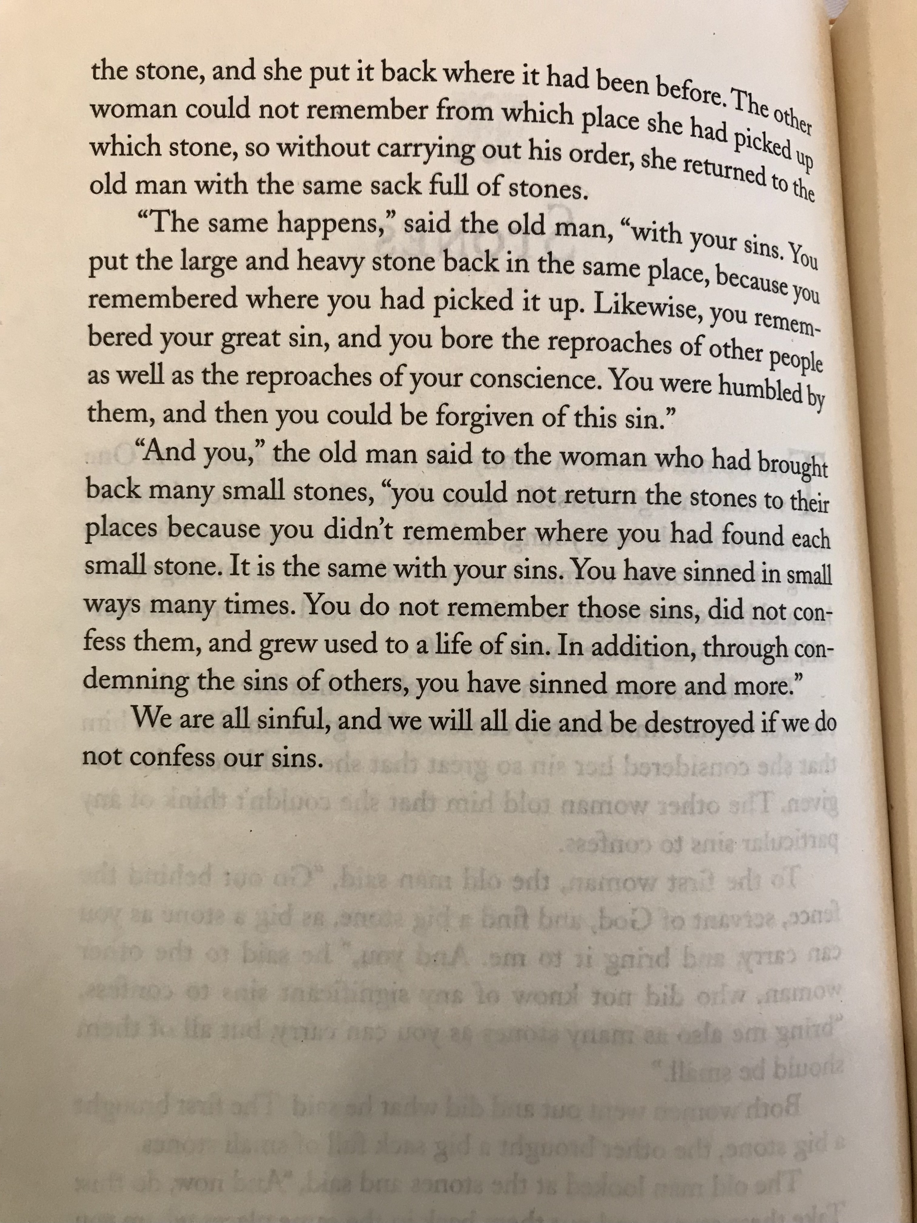 Nekem úgy tűnik, hogy Jézus Krisztus szerint lehetséges, hogy egy nagy követ / nagy bűnt őszintén lerakó ember / asszony utána a sok-sok kis követ / bűnt már lerakni nemigen tudó ember / asszony sorsára juthat, ha nem vigyáz alapos, egyre érzékenyebb lelkiismeretvizsgálattal, töredelemmel, rendszeres őszinte szentgyónással a lelke tisztaságára. Az alábbi Jézus Krisztustól származó evangéliumi idézetet (Mt 12, 43-35) tartom idevágónak.